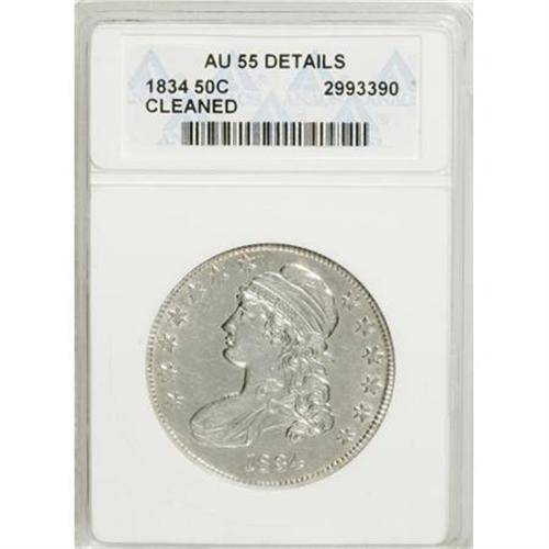 <B>1834 50C Small Date, Small Letters--Cleaned--ANACS. AU55 Details. O-113, R.1.</B></I> Mintage: 6,412,004. Numismedia Wsl. Price for NGC/PCGS coin in AU55: $283. (#6164)<BR><BR><B>Coin Engraver:</B> John Reich<BR><BR><b>Shipping:</b> Coins & Currency (<a target="_blank" href="http://www.heritageauctions.com/common/shipping.php">view shipping information</a>)
