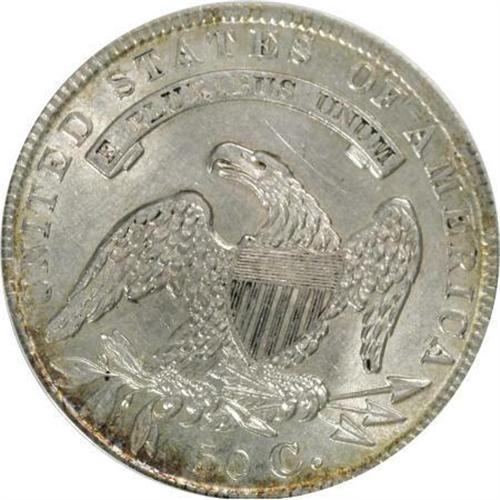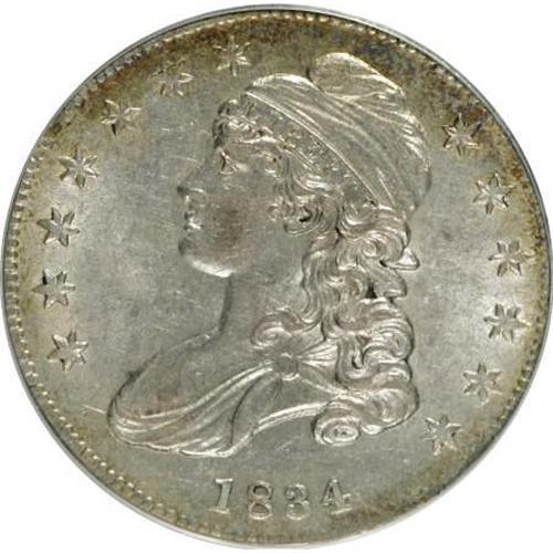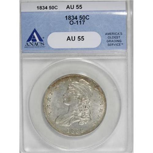 <B>1834 50C Small Date, Small Letters AU55 ANACS. O-117, R.2. </B></I>Mintage: 6,412,004. Numismedia Wsl. Price for NGC/PCGS coin in AU55: $283. (#6166)<BR><BR><B>Coin Engraver:</B> John Reich<BR><BR><b>Shipping:</b> Coins & Currency (<a target="_blank" href="http://www.heritageauctions.com/common/shipping.php">view shipping information</a>)