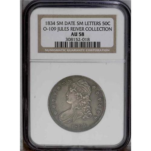 1834 50C Small Date, Small Letters AU58 NGC. O-109, R. 1834[50C] Small Date, Small Letters AU58 NGC.
