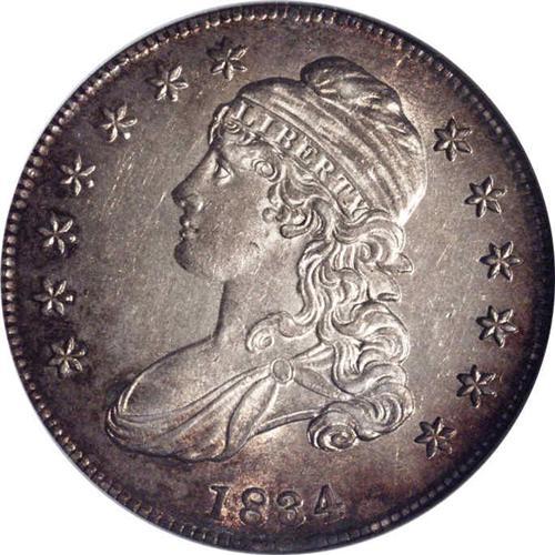 <B>1834<50C> Small Date, Small Letters AU58 NGC.</B></I> O-111, R.1. Stars six and seven are recut at their upper points on this variety. The O-111 reverse die is confirmed by the unusual positions of ATES, with the A highest and the subsequent letters progressing downward. This lovely, beautifully toned specimen has silver-gray centers and sunset-orange at the peripheries, with reverse splashes of aqua. The strike is bold, luster abounds, and perusal with a glass reveals no noticeable distractions. Envelope Included.