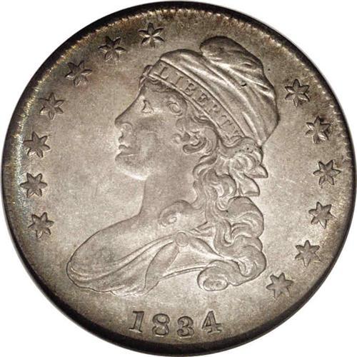<B>1834<50C> Small Date, Small Letters AU58 NGC.</B></I> O-112, R.3. Sometimes referred to as the "Daisy Star Seven" variety. This specimen has dull mint luster, with a thin crescent of aqua at each side. Perusal with a glass shows a couple of small die breaks and an extra blob of metal, as made, on Liberty's cap near the peak. Envelope Included.
