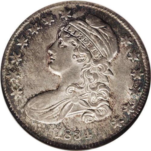 <B>1834<50C> Small Date, Small Letters AU58 NGC.</B></I> O-114, R.1. Very similar to O-113. Obverse stars 3, 4, and 8 are recut. The lavender-purple and cobalt-blue patina lends significant eye appeal. A lustrous example that has pleasing surfaces that are only faintly worn. The central devices are well struck, but the stars are mostly flat, and LUR in PLURIBUS is weakly struck.<BR><I>Ex: 1996 ANA.</B></I> Envelope Included.