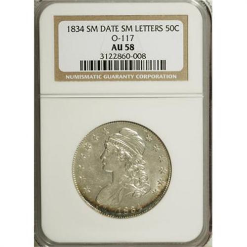 <B>1834 50C Small Date, Small Letters AU58 NGC.</B></I> O-117, R.2. Slender ocean-blue and golden-brown bands visit the lower obverse, but this generally lustrous half dollar is primarily untoned. No marks merit mention, and the strike is good despite softness on the IB in PLURIBUS.<BR><BR><B>Coin Engraver:</B> John Reich<BR><BR><b>Shipping:</b> Coins & Currency (<a target="_blank" href="http://www.heritageauctions.com/common/shipping.php">view shipping information</a>)