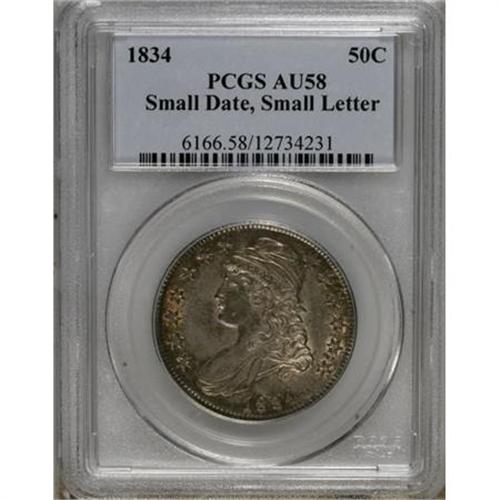 <B>1834 50C Small Date, Small Letters AU58 PCGS.</B></I> PCGS Population (63/102). NGC Census: (0/0). (#6166)<BR><BR><B>Coin Engraver:</B> John Reich<BR><BR><b>Shipping:</b> Coins & Currency (<a target="_blank" href="http://www.heritageauctions.com/common/shipping.php">view shipping information</a>)