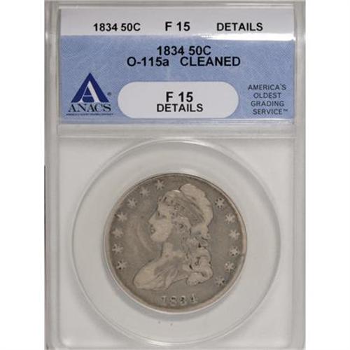 <B>1834 50C Small Date, Small Letters--Cleaned--ANACS. Fine 15 Details. O-115a.</B></I> NGC Census: (0/0). PCGS Population (4/418). (#6166)<BR><BR><B>Coin Engraver:</B> John Reich<BR><BR><b>Shipping:</b> Coins & Currency (<a target="_blank" href="http://www.heritageauctions.com/common/shipping.php">view shipping information</a>)