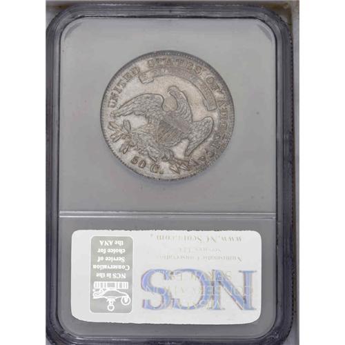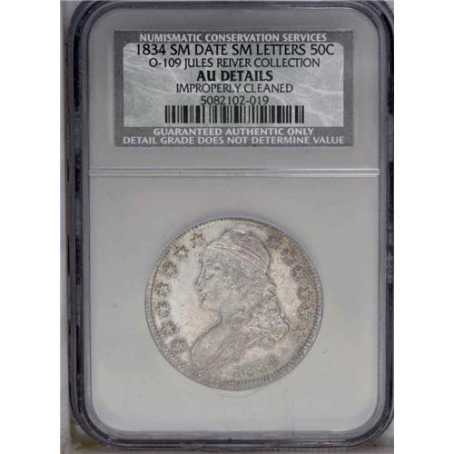 <B>1834<50C> Small Date, Small Letters--Improperly Cleaned--NCS. AU Details.</B></I> O-109, R.1. A well struck example with rather subdued surfaces that show slate-gray toning over both sides, augmented by rich antique-gold iridescence near the borders. Clockwise die rotation of forty to forty-five degrees is noted. A few wispy hairlines are located in the obverse fields. Envelope Included.