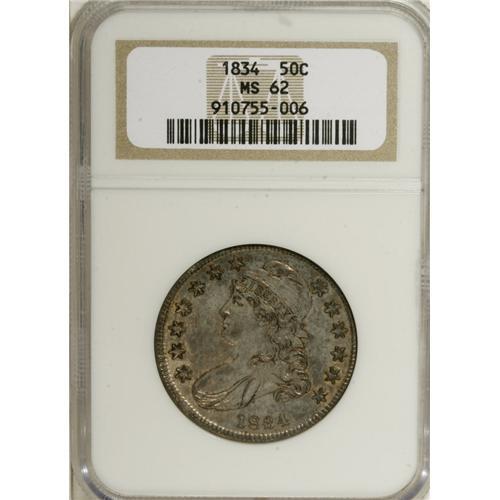 <B>1834 50C Small Date, Small Letters MS62 NGC.</B></I> O-109, R.1. Well struck except for the top two stars at the upper right. This glistening Capped Bust Half has iridescent peach, tan, and sea-green color on the reverse, as well as deeper cobalt-blue and lavender toning on the obverse.<BR><BR><b>Shipping:</b> Coins & Currency (<a target="_blank" href="http://www.heritageauctions.com/common/shipping.php">view shipping information</a>)