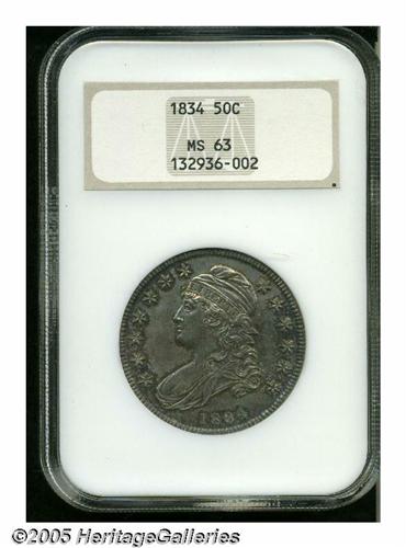 <B>1834<50C> Small Date, Small Letters MS63 NGC.</B></I> O-109, R.1. Dappled forest-green, russet, and cream-gray colors adorn this satiny and exquisitely struck representative. No mentionable marks are present. Certified in an early NGC holder.