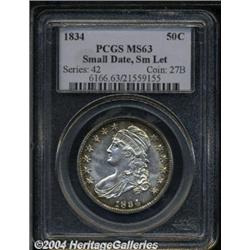 <B>1834<50C> Small Date, Small Letters MS63 PCGS.</B></I> O-109, R.1. The bright, lustrous surfaces are virtually untoned except for medium blue and golden-brown coloration around the rims. The design elements are generally well struck, except for softness in Liberty's upper and middle hair curls, and at the interfaces of the shield with the eagle's wings. The nearly pristine surfaces reveal no significant abrasions, and only a few wispy hairlines. Population: 17 in 63, 15 finer (3/04). <BR><BR><B>Important notice:</B> Heritage usually auctions material at the rate of 200-250 lots per hour. On some occasions eBay Live bid software or the Internet may not be able to keep up with the pace of the auction. We recommend placing a realistic absentee bid now as insurance to avoid disappointment. Occasionally the auctioneer may eliminate or reject an eBay Live bid, and the auctioneer may also reopen a lot after the close of the eBay live bidding (usually because we missed an audience bid), and may reject your bid even if it shows you as the winning bidder. By bidding via eBay Live, you agree that Heritage may award the lot to another bidder at its sole discretion under the circumstances described above or any other reasonable circumstances. Since eBay bids are not shown to us until we open the lot on the floor, we treat those bids just like floor bids. In most cases the floor responds before the eBay bid is presented to us, due to Internet lag time, so for consistency we have made it a policy that floor bids are always considered first over tie eBay live bids. Also please note that all Heritage lots purchased through eBay Live carry a 20% Buyer's Premium. Please make sure you read the Terms and Conditions before you bid.