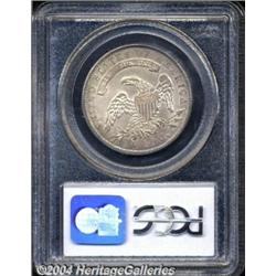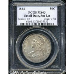 <B>1834<50C> Small Date, Small Letters MS63 PCGS.</B></I> O-113, R.1. Dusky apricot and silver-gray colors embrace this satiny Capped Bust Half. The URI in PLURIBUS and a couple of the peripheral stars are typically struck. Pleasing despite a subdued contact mark on the cheekbone. <BR><BR><B>Important notice:</B> Heritage usually auctions material at the rate of 200-250 lots per hour. On some occasions eBay Live bid software or the Internet may not be able to keep up with the pace of the auction. We recommend placing a realistic absentee bid now as insurance to avoid disappointment. Occasionally the auctioneer may eliminate or reject an eBay Live bid, and the auctioneer may also reopen a lot after the close of the eBay live bidding (usually because we missed an audience bid), and may reject your bid even if it shows you as the winning bidder. By bidding via eBay Live, you agree that Heritage may award the lot to another bidder at its sole discretion under the circumstances described above or any other reasonable circumstances. Since eBay bids are not shown to us until we open the lot on the floor, we treat those bids just like floor bids. In most cases the floor responds before the eBay bid is presented to us, due to Internet lag time, so for consistency we have made it a policy that floor bids are always considered first over tie eBay live bids. Also please note that all Heritage lots purchased through eBay Live carry a 20% Buyer's Premium. Please make sure you read the Terms and Conditions before you bid. </span></font></tr></table></td></tr></table>