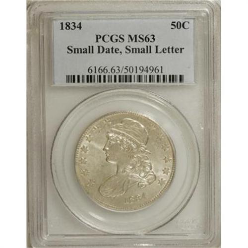 <B>1834 50C Small Date, Small Letters MS63 PCGS.</B></I> O-114, R.1. Very similar to O-113, but stars 3 and 4 are recut. A brilliant and satiny silver type coin with smooth fields and good eye appeal. The major devices are precisely struck, but the stars and denticles are soft near 3 and 9 o'clock.<BR><BR><B>Coin Engraver:</B> John Reich<BR><BR><b>Shipping:</b> Coins & Currency (<a target="_blank" href="http://www.heritageauctions.com/common/shipping.php">view shipping information</a>)
