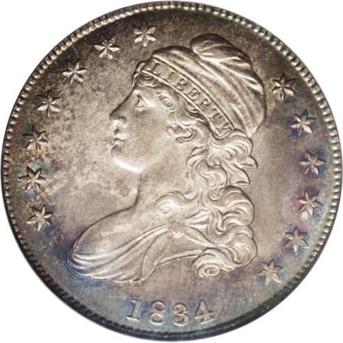 <B>1834<50C> Small Date, Small Letters MS64 NGC.</B></I> O-111, R.1. Overton's "child's head" variety, so-named for Liberty's wide-eyed and innocent expression. This satiny and sharply struck near-Gem has blushes of mauve, tan, and electric-blue colors. The surfaces are pleasingly undisturbed, and the dies are rotated slightly counterclockwise.