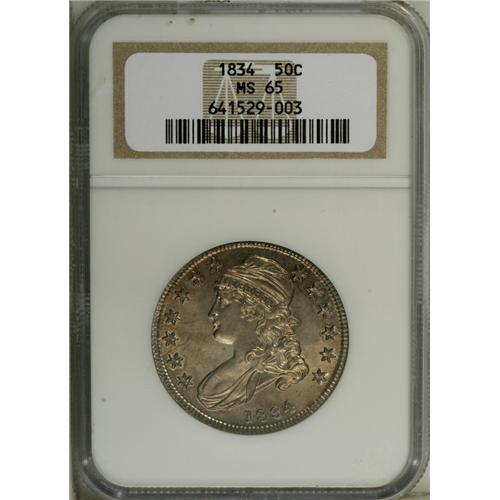 <B>1834 50C Small Date, Small Letters MS65 NGC.</B></I> O-109, R.1. This is one of several common varieties for the date, an excellent candidate for collectors who only desire a single example representing the 1834 half dollar coinage, or perhaps the design type. Of course, the variety specialist will also give this piece due consideration for its superior aesthetic appeal. It is a fully lustrous Gem with satiny fields and frosty devices that impart a subtle cameo appearance. Both sides have delightful ivory color with considerable gold toning. Although star 8 is flat, the design definition is bold across both sides. This is a splendid Gem, a piece that should see considerable activity when it crosses the auction block.<BR><I>From The Westmoreland, Virginia Collection, Part Two.</B></I><BR><BR><b>Shipping:</b> Coin/Currency (<a target="_blank" href="http://www.heritageauctions.com/common/shipping.php">view shipping information</a>)