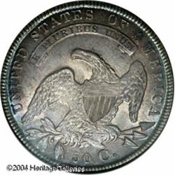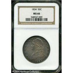 1834 50C Small Date, Small Letters MS66 NGC. O-111 <B>1834 50C Small Date, Small Letters MS66 NGC.</B></I> O-111, R.1. The popular "Child's Head" variety. Overton comments, "The face is noticeable for its round cheeked, wide-eyed appearance." However, a pair of diagonal die lines within the lower half of the shield provides a less subjective diagnostic. Peach, pink, battleship-gray, gold, and ocean-blue colors grace this nicely struck and lovingly preserved premium Gem. A beautiful example that is worthy of the finest quality 19th Century silver type set. <BR><BR><B>Important notice:</B> Heritage usually auctions material at the rate of 200-250 lots per hour. On some occasions eBay Live bid software or the Internet may not be able to keep up with the pace of the auction. We recommend placing a realistic absentee bid now as insurance to avoid disappointment. Occasionally the auctioneer may eliminate or reject an eBay Live bid, and the auctioneer may also reopen a lot after the close of the eBay live bidding (usually because we missed an audience bid), and may reject your bid even if it shows you as the winning bidder. By bidding via eBay Live, you agree that Heritage may award the lot to another bidder at its sole discretion under the circumstances described above or any other reasonable circumstances. Since eBay bids are not shown to us until we open the lot on the floor, we treat those bids just like floor bids. In most cases the floor responds before the eBay bid is presented to us, due to Internet lag time, so for consistency we have made it a policy that floor bids are always considered first over tie eBay live bids. Also please note that all Heritage lots purchased through eBay Live carry a 20% Buyer's Premium. Please make sure you read the Terms and Conditions before you bid. This lot is being auctioned in conjunction with a live floor auction by Heritage Galleries & Auctioneers. All final auction and invoice information will be supplied by Heritage Galleries & Auctioneers, and all other information should be considered preliminary. Lot:6082