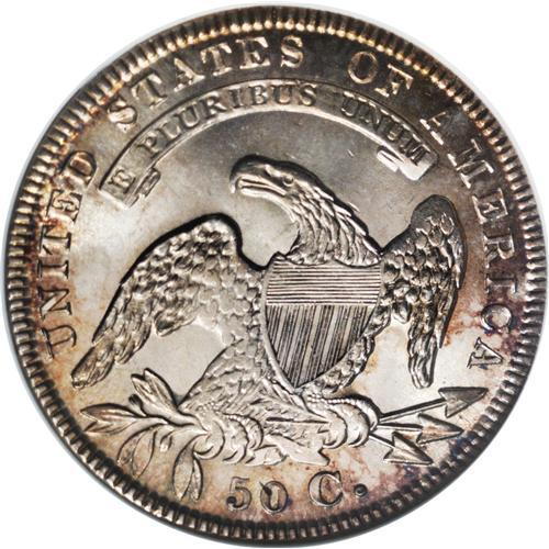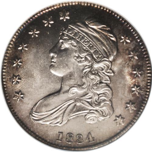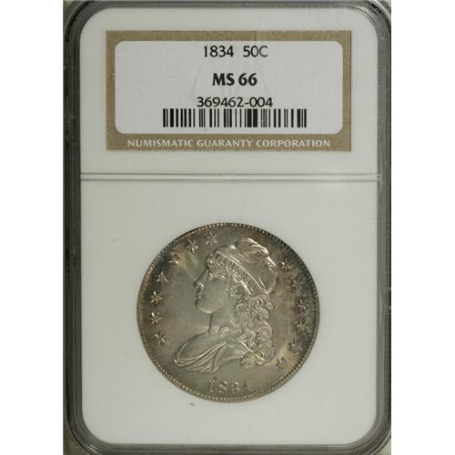 <B>1834 50C Small Date, Small Letters MS66 NGC.</B></I> O-111, R.1. The distinctive "Child's Head" variety. Overton comments, "The face is noticeable for its round cheeked, wide-eyed appearance." However, a pair of diagonal die lines within the lower half of the shield provides a less subjective diagnostic. This example displays bountiful luster and tinges of carmine, russet, and blue toning about the peripheral devices.<BR><BR><b>Shipping:</b> Coins & Currency (<a target="_blank" href="http://www.heritageauctions.com/common/shipping.php">view shipping information</a>)