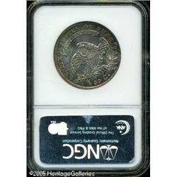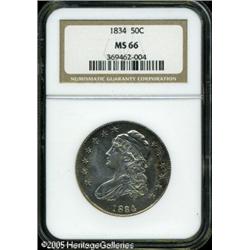 <B>1834 50C Small Date, Small Letters MS66 NGC.</B></I> O-111, R.1. The distinctive "Child's Head" variety. Overton comments, "The face is noticeable for its round cheeked, wide-eyed appearance." However, a pair of diagonal die lines within the lower half of the shield provides a less subjective diagnostic. This example displays bountiful luster and tinges of carmine, russet, and blue toning about the peripheral devices. Lot:7006