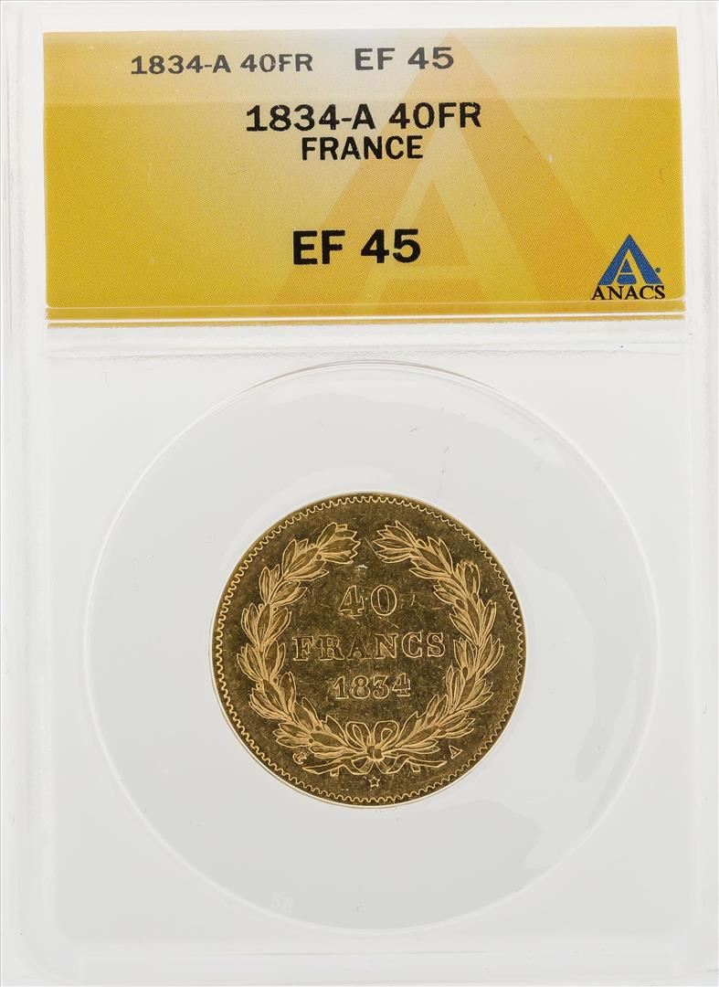One 1834-A 40 Francs Gold Coin ANACS EF45. ANACS Appraised.