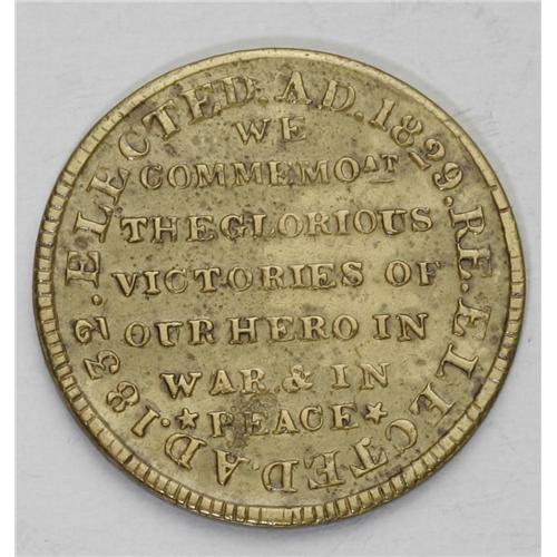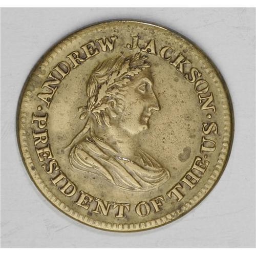 <B>1834 Andrew Jackson, Low-4, Rulau-HT-6, DeWitt-1834-27, R.2, XF40 Uncertified.</B></I> Brass. Roman Head. A pleasing and well made example of the type. All of the reverse letters are completely struck. A few shallow planchet flaws are noted on each side, but the greenish surfaces are free of abrasions. Perhaps conservatively graded at XF40. The same comments as to the origin of these brass issues apply as on Low 3 in the previous lot. These Low 4 tokens are not sharply struck.<BR><I>From The Troy Wiseman Collection.</B></I>