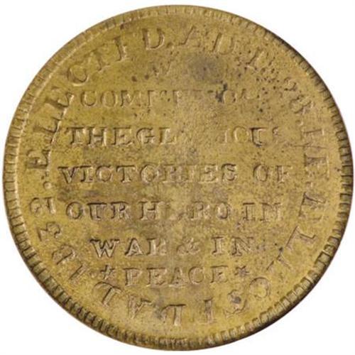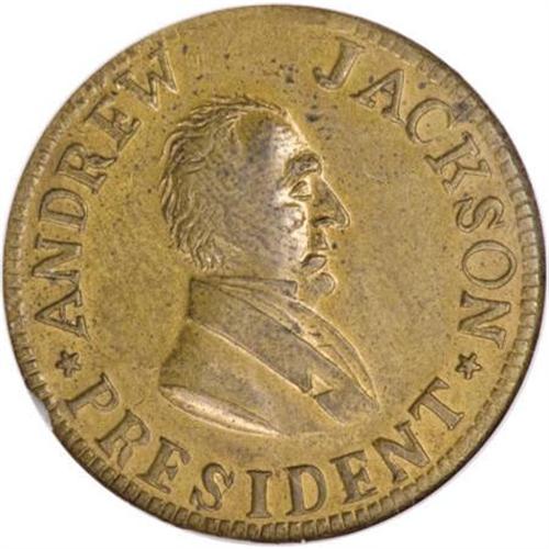 <B>1834 Andrew Jackson, HT-5, MS61 NGC.</B></I> Low-3, DeWitt-1834-29, R.3.<B> </B></I>Brass. Large Letters Obverse. A lustrous example with slightly reflective surfaces. There is an area on the reverse that is weakly struck (typical for this piece), and a bit of planchet roughness obstructs part of the ORI in GLORIOUS. A nice Uncirculated example, and very scarce in Mint State. This is one of the early brass political issues that were unlisted in Low's early edition of 1886, but were added in the 1900 edition. As is the case with Low-1, this issue was undoubtedly a political token and not intended to circulate as a cent token.<BR><I>From The Madison Collection.</B></I><BR><BR><b>Shipping:</b> Coins & Currency (<a target="_blank" href="http://www.heritageauctions.com/common/shipping.php">view shipping information</a>)