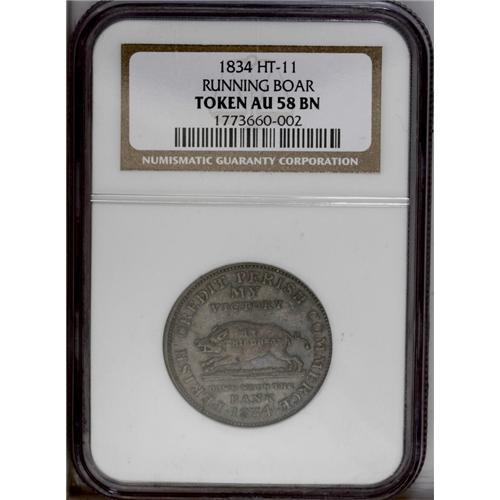 <B>1834 Andrew Jackson, Running Boar, Low-10, Rulau-HT-11, R.2, AU58 NGC.</B></I> Ex: Ford Collection. Copper. Wide Shoulders. Lustrous and deep brown with iridescent blue-green undertones in the fields. Free of distracting marks, with a wide die crack from the lower obverse rim through the boar and to the upper left rim near 10 o'clock. The boars snout points to between H of PERISH and C of CREDIT.<BR><I>From The Troy Wiseman Collection.</B></I>