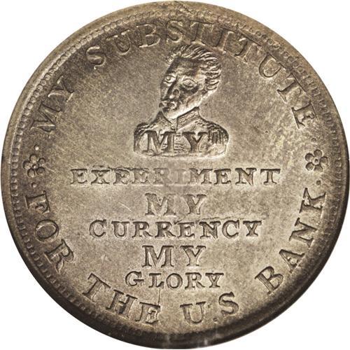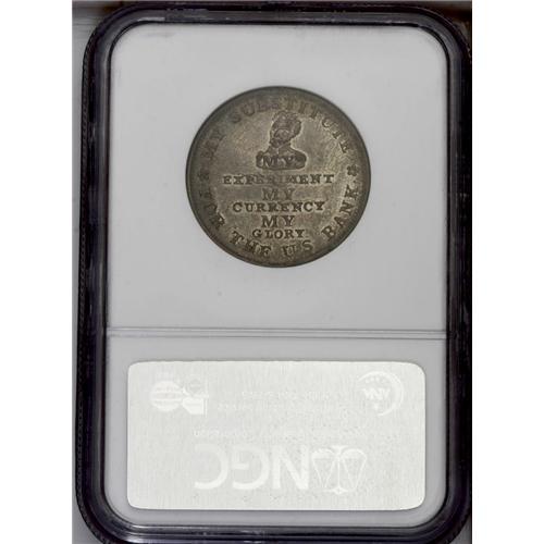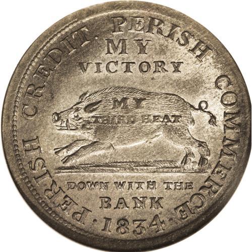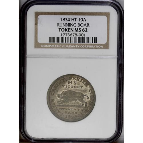 <B>1834 Andrew Jackson, Running Boar, Low-9A, Rulau-HT-10A, R.3, MS62 NGC.</B></I> Silvered Brass. Narrow Shoulders. Nearly full silvering remains evident on each side. The attractive original toning includes olive-gray and mint-green elements. Strong on the reverse portrait; typically soft on the boar's shoulder below THIRD. A minor abrasion resides beneath E in PERISH, and roller marks (as struck) are noted across PER and the tops of M, on the central reverse. A nice Uncirculated example. This silvered brass token is definitely more elusive than it R3 rating would indicate.<BR><I>From The Troy Wiseman Collection.</B></I>