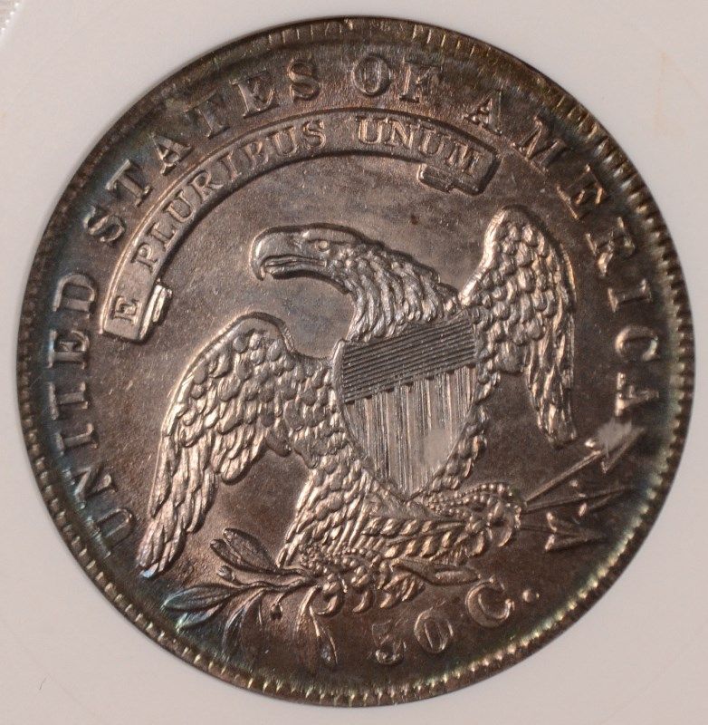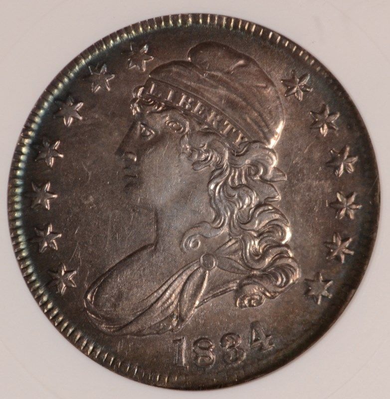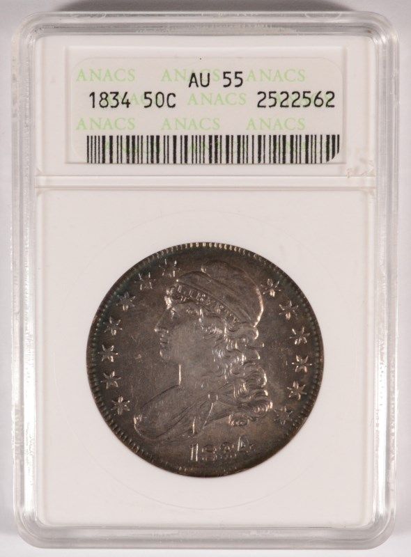 1834 BUST HALF DOLLAR, ANACS AU-55 VERY PRETTY COLORS, BLUES AND WHITES