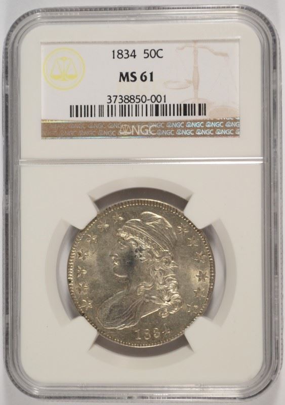 1834 BUST HALF DOLLAR, NGC MS-61 WHITE! SUPER TYPE COIN, LOOK MS-63!