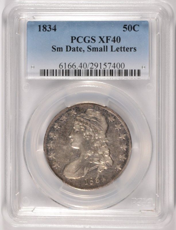 1834 BUST HALF DOLLAR, PCGS XF-40 SMALL DATE, SMALL LETTERS, NICE !!