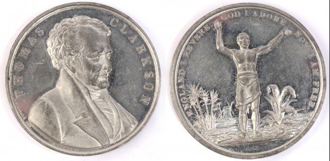 Thomas Clarkson bust ? r. from 1832 Anti-Slavery Convention medal. Rev. Rejoicing freed slave from BHM 1668. By B.R. Haydon, des., struck by J. Davis, Birmingham. White metal, 51.6mm. Boldly reflective surfaces. Uncirculated condition. [Ex Joseph Lepczyk, May 1984 Sale, lot 30.]