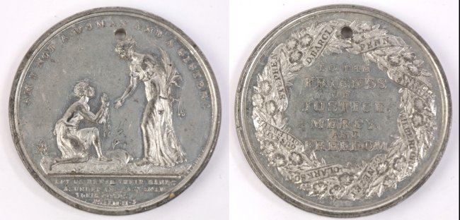 Friends Of Mercy, Justice & Freedom Medal. Justice, kneeling slave woman, AM I NOT A WOMAN AND A SISTER, Rev. Flower wreath interwoven with names including CLARKSON, WILBERFORCE, TOUSSAINT L?OUVERTURE. By Thomas Halliday. BHM 1669. Holed, Uncirculated condition.