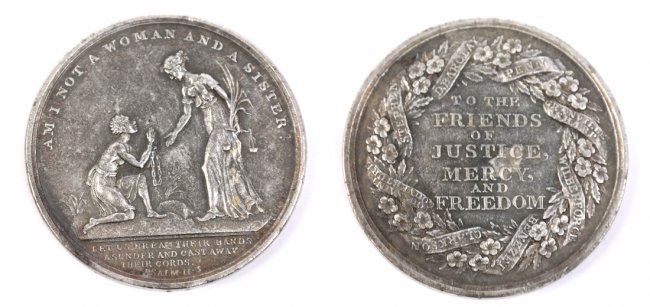 1834 Britain Friends Of Mercy, Justice & Freedom Medal, white metal silver plate. Justice, kneeling slave woman, AM I NOT A WOMAN AND A SISTER, Rev. Flower wreath interwoven with names including CLARKSON, WILBERFORCE, TOUSSAINT L?OUVERTURE. By Thomas Halliday. BHM 1669. Choice Extremely Fine condition. [Ex Joseph Lepczyk Feb. 1978 sale, lot 1744.]