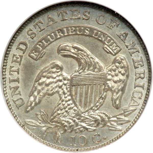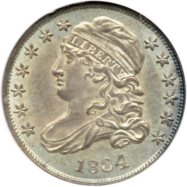 1834 Capped Bust Dime. Large 4. PCI graded MS-64. Our grade is MS-63 frosty and lightly toned. There is lovely silvery luster on this piece which has naturally toned leaving behind its beauty and serenety -- or to say, originality -- far better than most Capped Bust Dimes in similar condition. Surely worth placing a bid on this well struck coin.