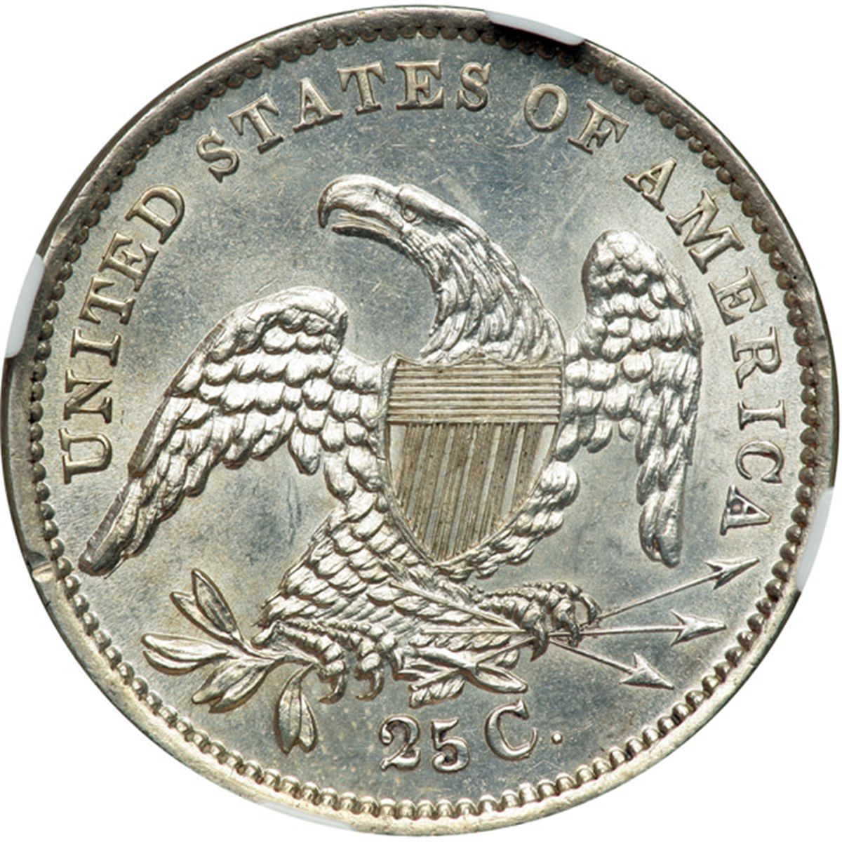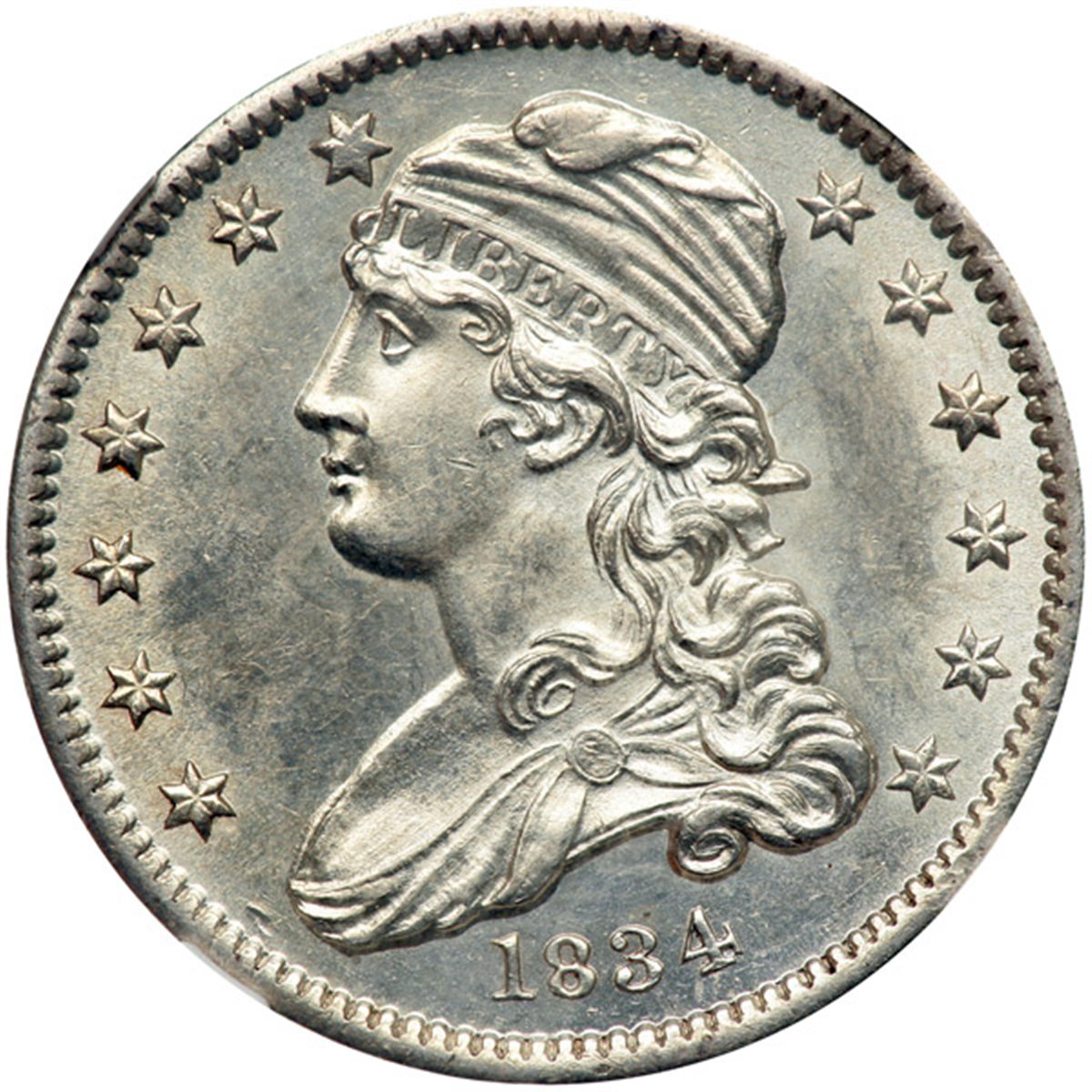 1834 Capped Bust Quarter Dollar. NGC Unc Details, improperly cleaned. Untoned and well struck. We note some minor hairlines.