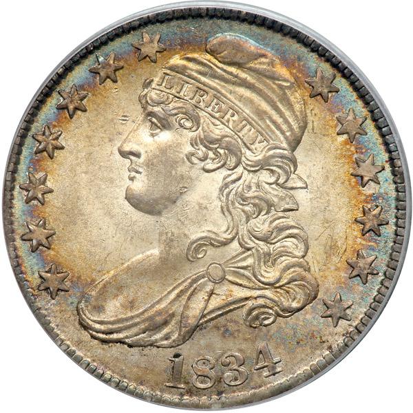 1834. Large date, small letters. PCGS graded MS-64 CAC Approved. Well struck and fully lustrous with lovely natural toning on both sides. One look at this beauty and you will see why CAC gave its approval. Pop 31; 12 in 65, 1 in 67 (PCGS # 6165) .