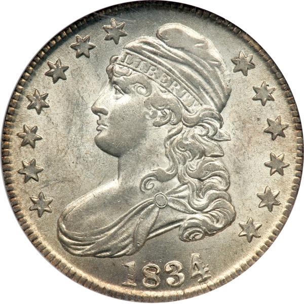 1834 Capped Bust Half Dollar. . O-106, R-1. Large crude 4 over small 4. NGC graded MS-63. A lovely fully lustrous example with glittering frosty mint surfaces throughout. On this variety the date is 8 mm. wide with a tall rather narrow 4 that is crudely cut over a small 4. Part of the crossbar of the first 4 is visible about one-quarter mm. above crossbar of the final large 4.