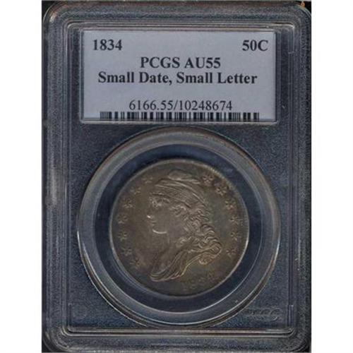<b>1834 Capped Bust Half Dollar. Small date and letters. PCGS graded AU55.</b> Attractively toned <b>(PCGS # 6166)</b>