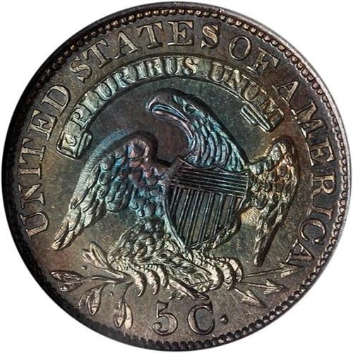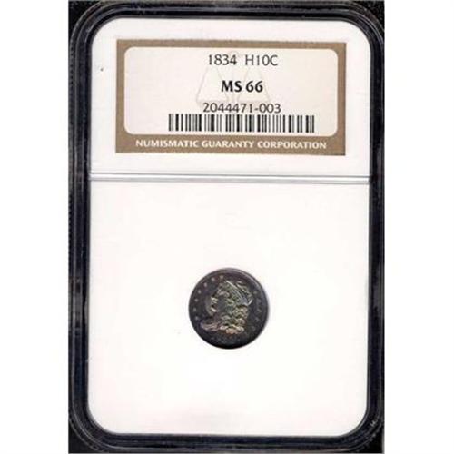 <b>1834 Capped Bust Half Dime. NGC graded MS66.</b> Unstoppable luster erupts flamboyantly beneath the toning highlights of this admirable capped bust coin, while gusts of faint toning form an aura at the edges of the design elements of this satiny gem. The strike, as expected, is strong enough to earn even a critic's approval, save for a limited area of lightness at the eagle's wing <b>(PCGS # 4281)</b> <i>