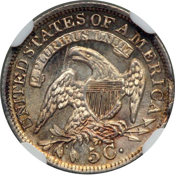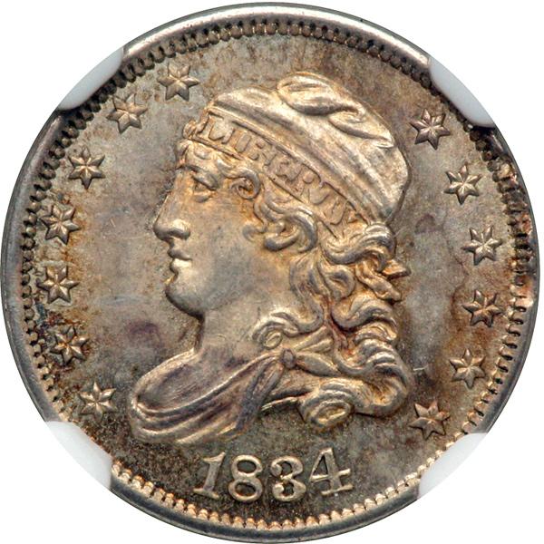 1834 Capped Bust Half Dime. NGC Unc. Details, rim damage, bent. Our grade is MS-63 Prooflike. We believe the rim damage is a flaw as made. This coin has the look of a Proof and is actually very attractive.