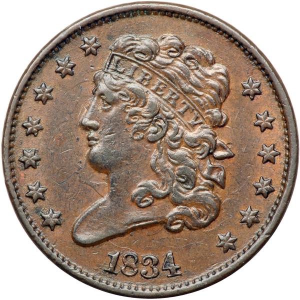 1834 C-1 R1 EF40. Glossy light steel brown with darker steel brown and chocolate toning on the highpoints. The protected areas are covered with satiny mint frost. Both sides display some very tiny ticks scattered about, none notable. MDS, Manley state 2.0, with sharp die clashmarks on both sides. Davy #34.1.9.