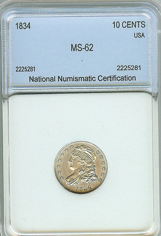 1834 CAPPED BUST SILVER DIME NNC MS62