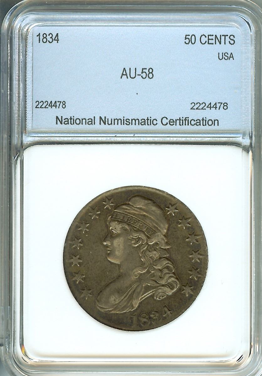 1834 CAPPED BUST SILVER HALF DOLLAR NNC AU58 SCARCE!