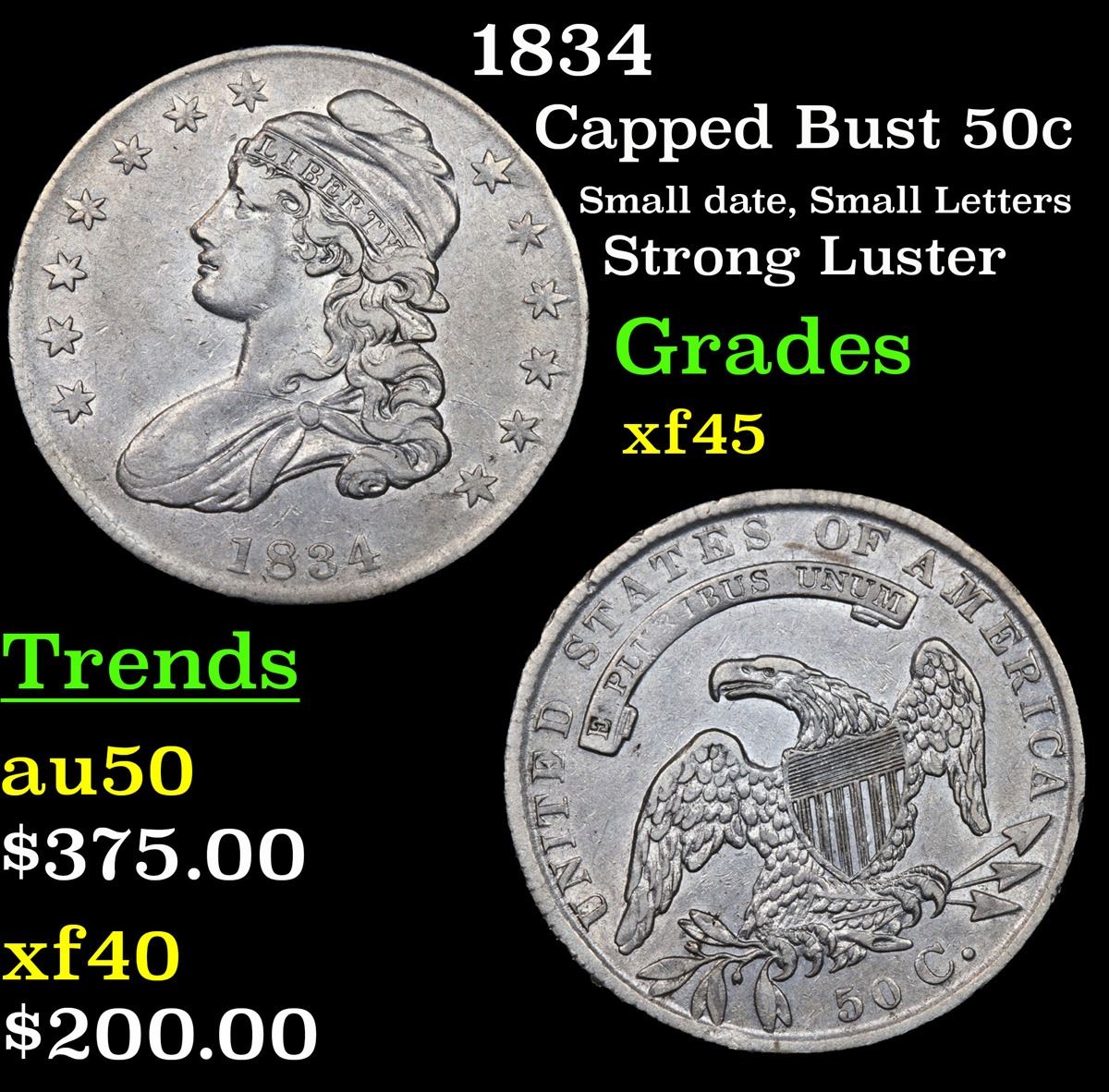 1834 Small date, Small Letters Strong Luster Capped Bust Half Dollar 50c Grades xf+.