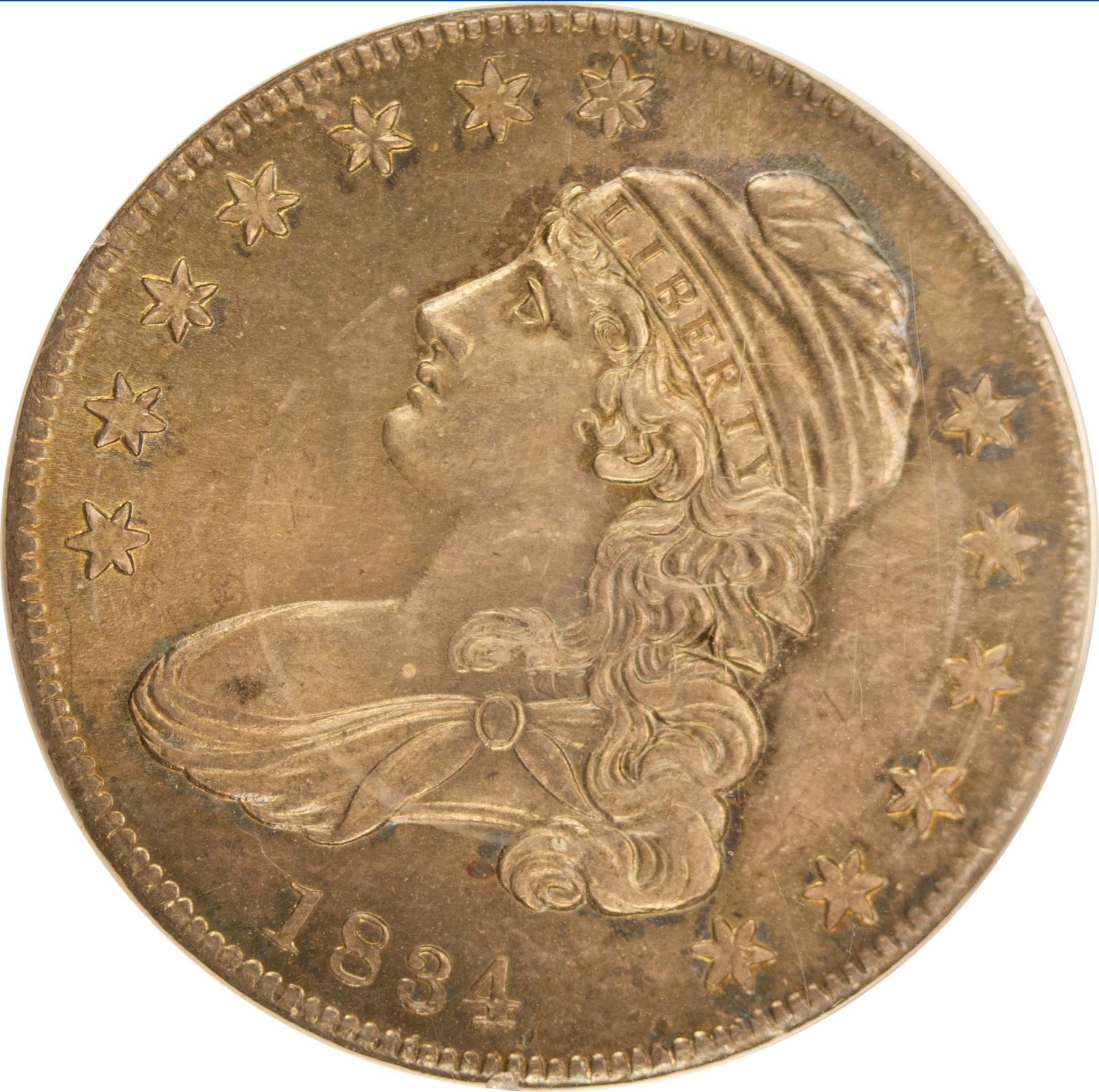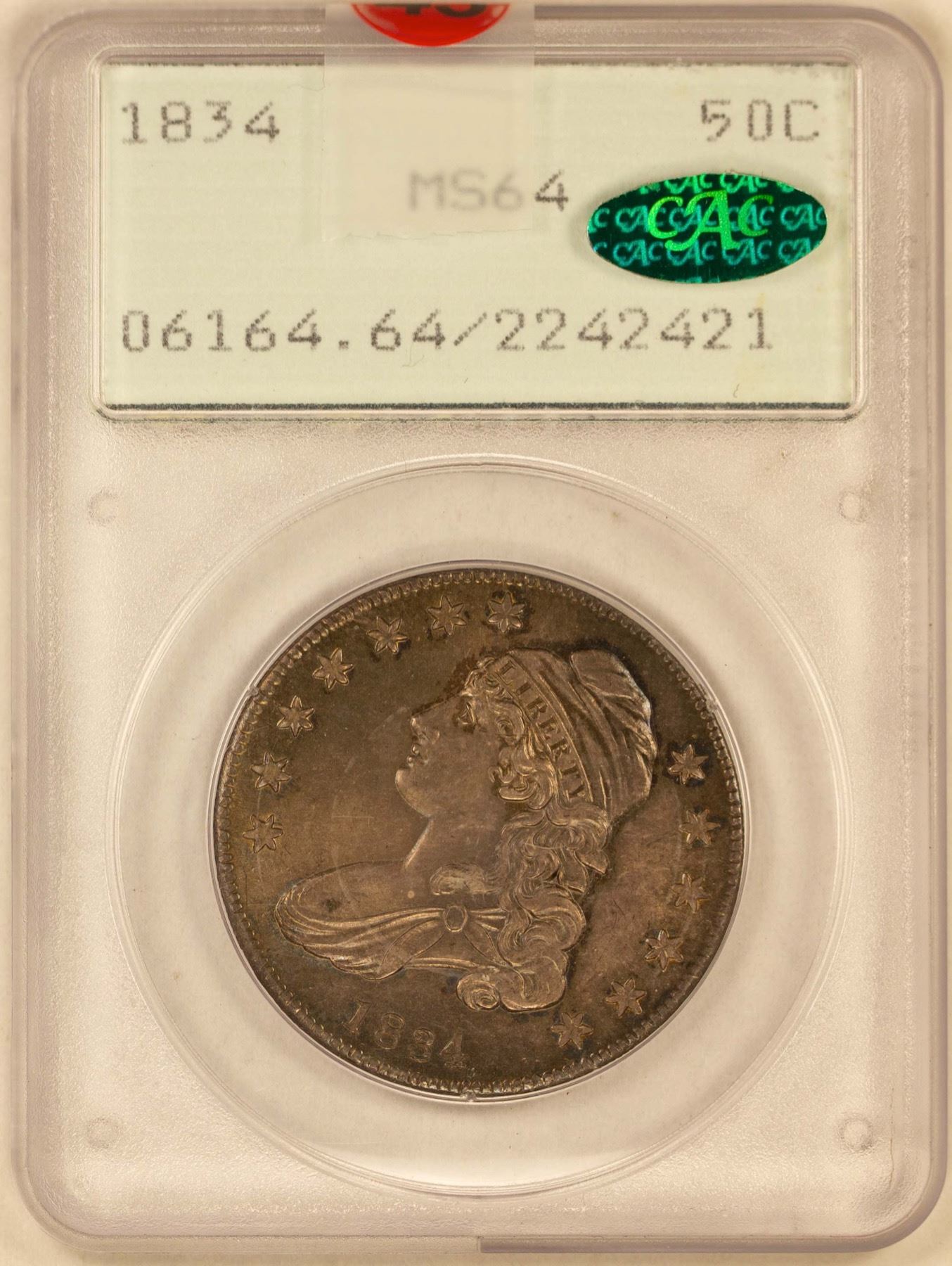 1834 Capped Bust Half Dollar 50c Overton-121 R.3 PCGS MS-64 CAC (PCGS Rattler Holder) (Toned)