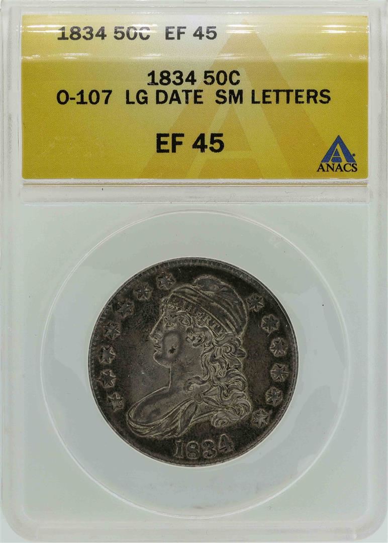 One 1834 Capped Bust Half Dollar Coin O-107 Large Date Small Letters ANACS EF45. ANACS Certified.