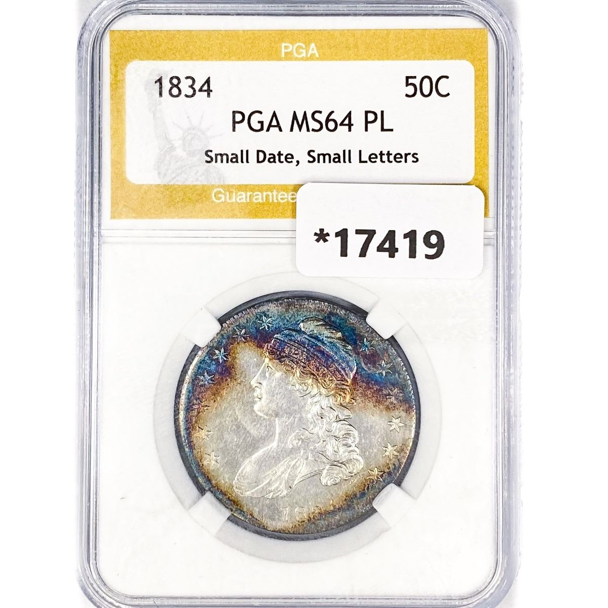 1834 Capped Bust Half Dollar PGA MS64 PL, Sm Dt,