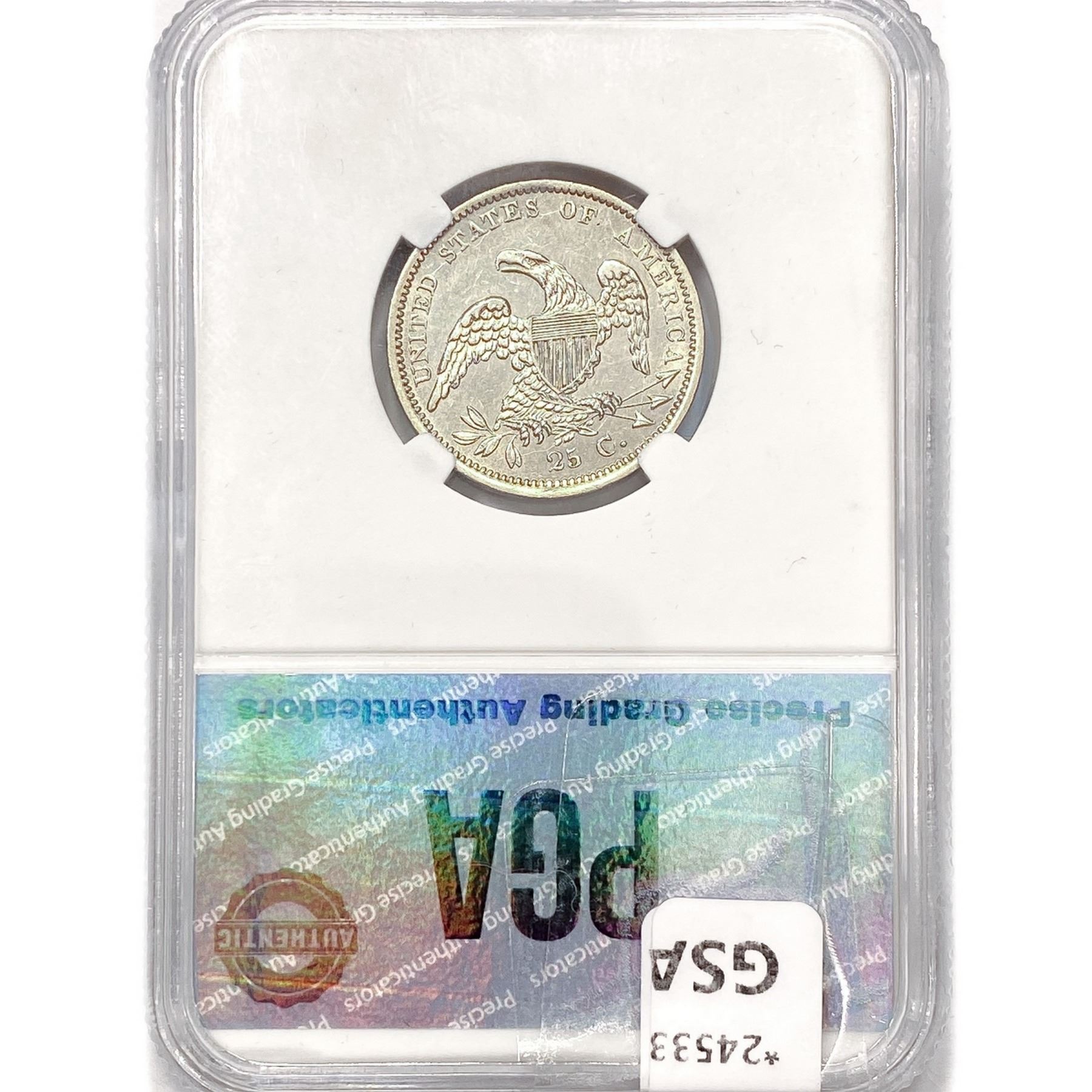 COINS AND CURRENCY LISTED IN GSA’S CATALOG AS GRADED AND ENCAPSULATED BY PCGS, NGC, ANACS, ICG, PCGS CURRENCY, PMG, PCGS BANKNOTE GRADING, CMC OR ANY OTHER THIRD-PARTY GRADING SERVICE ARE LIKEWISE SOLD “AS-IS” EXCEPT AS EXPRESSLY SET FORTH HEREIN. ALL THIRD-PARTY GRADING SERVICE GUARANTEES, INCLUDING AUTHENTICITY, ARE THE SOLE RESPONSIBILITY OF THE THIRD-PARTY GRADING SERVICE AND NOT WARRANTIES OR GUARANTEES OF GSA. BIDDERS SHOULD CONTACT THESE THIRD-PARTY GRADING SERVICES DIRECTLY WITH RESPECT TO ANY CLAIMS OR QUESTIONS THEY MAY HAVE CONCERNING THEIR GUARANTEES AND WARRANTIES. BIDDERS ACKNOWLEDGE AND AGREE THAT AUCTIONEER IS NOT BOUND BY OR LIABLE FOR ANY OPINION OR CERTIFICATION BY ANY THIRD-PARTY GRADING SERVICE. REMOVAL OF A PRODUCT FROM ITS PROTECTIVE CASING OR HOLDER OR ALTERATION OF ANY COIN HOLDER WAIVES ALL RIGHTS CONCERNING THE PRODUCT CONTAINED THEREIN.