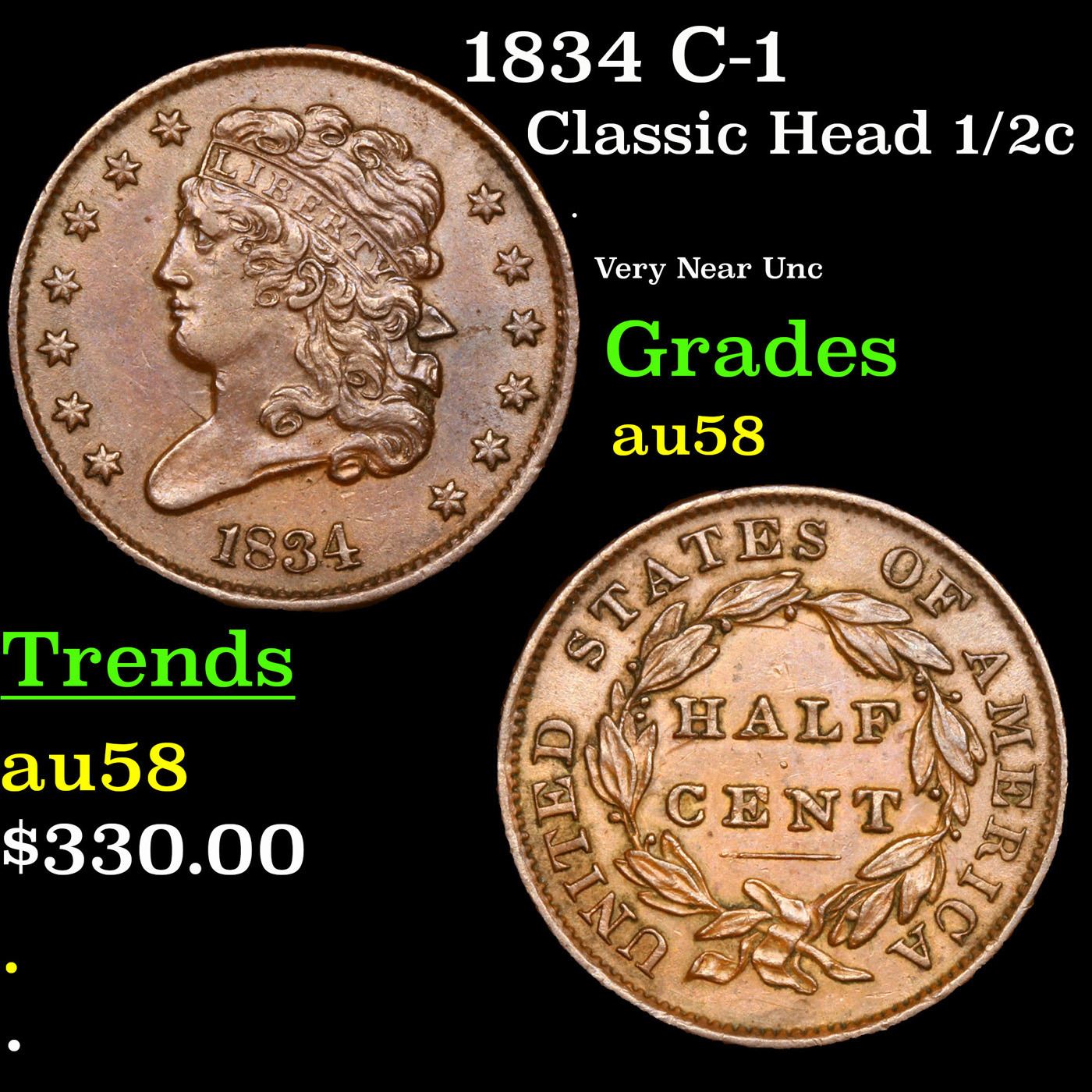 1834 C-1 Classic Head half cent 1/2c Grades Choice AU/BU Slider.
