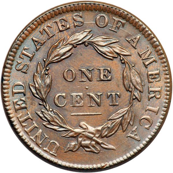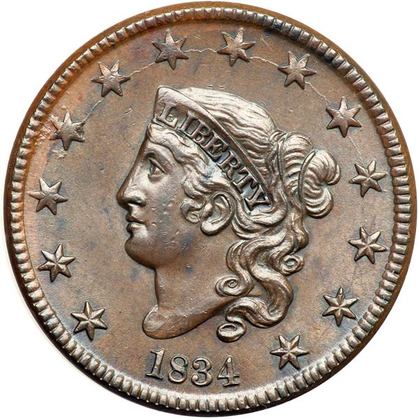 1834 Coronet Head Cent. PCGS graded MS-64 Brown. Lustrous medium steel brown with delicate overtones of bluish steel in protected areas. The surfaces are satiny and very attractive. A speck of darker olive toning high on the neck and a small rim nick under the wreath stem are the notable marks. MDS. Both dies are cracked, as always, and the fields are satiny from microscopic die flowlines. Crumbling shows around star 4, strongest between the right points, and the repunching inside the lower half of the C in AMERICA is clear. Called MS60 and tied for CC#5 in the Noyes census, his photo #36776. Our grade is MS60+. Pop 2; 1 in 65BN, 1 in 65 RB, 1 in 66 RB. DWH #0824 (PCGS # 37051) .