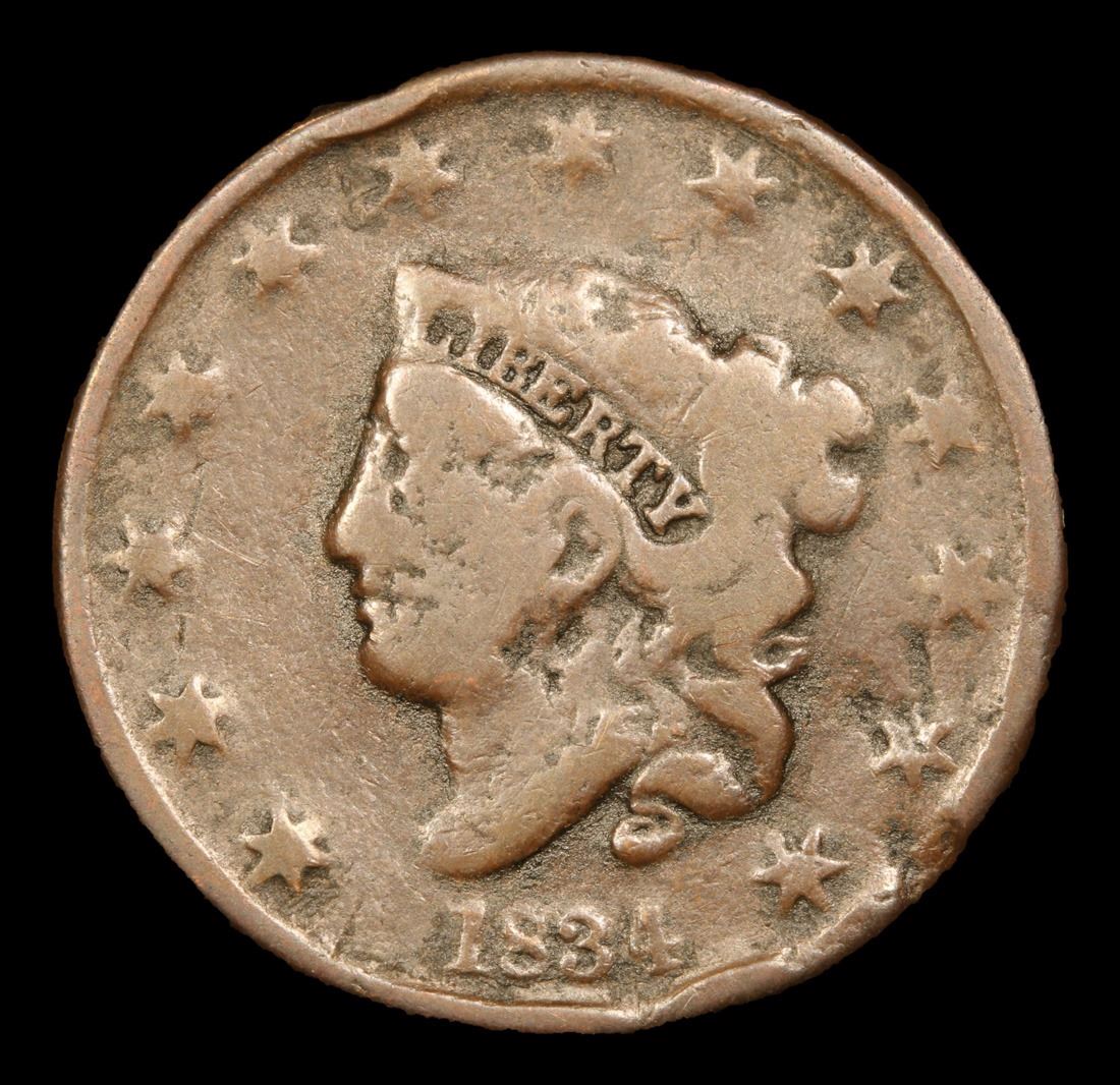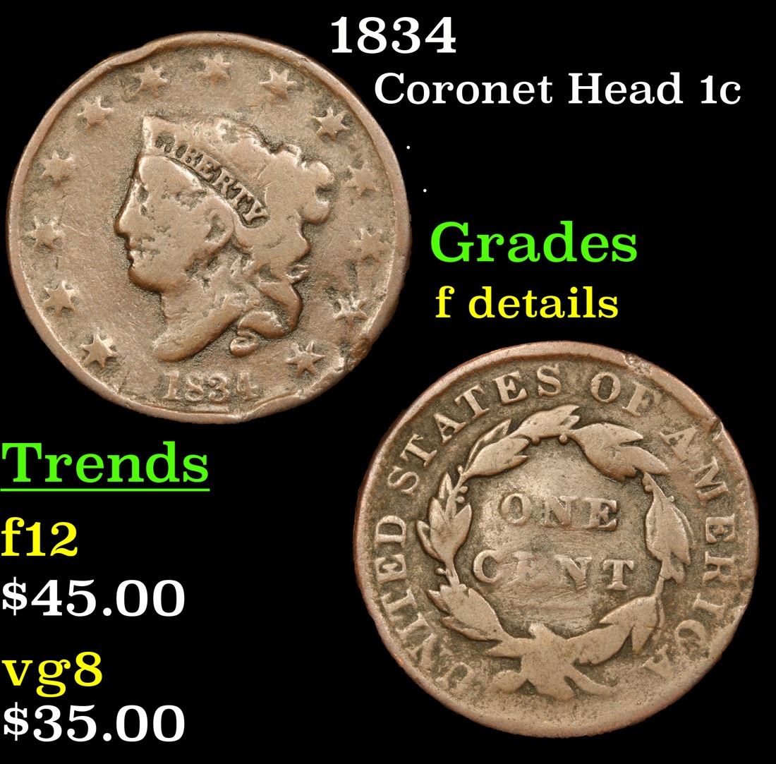 1834 . . Coronet Head Large Cent 1c Grades f details.