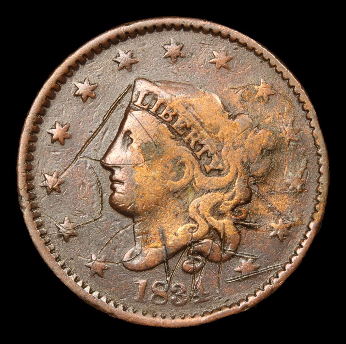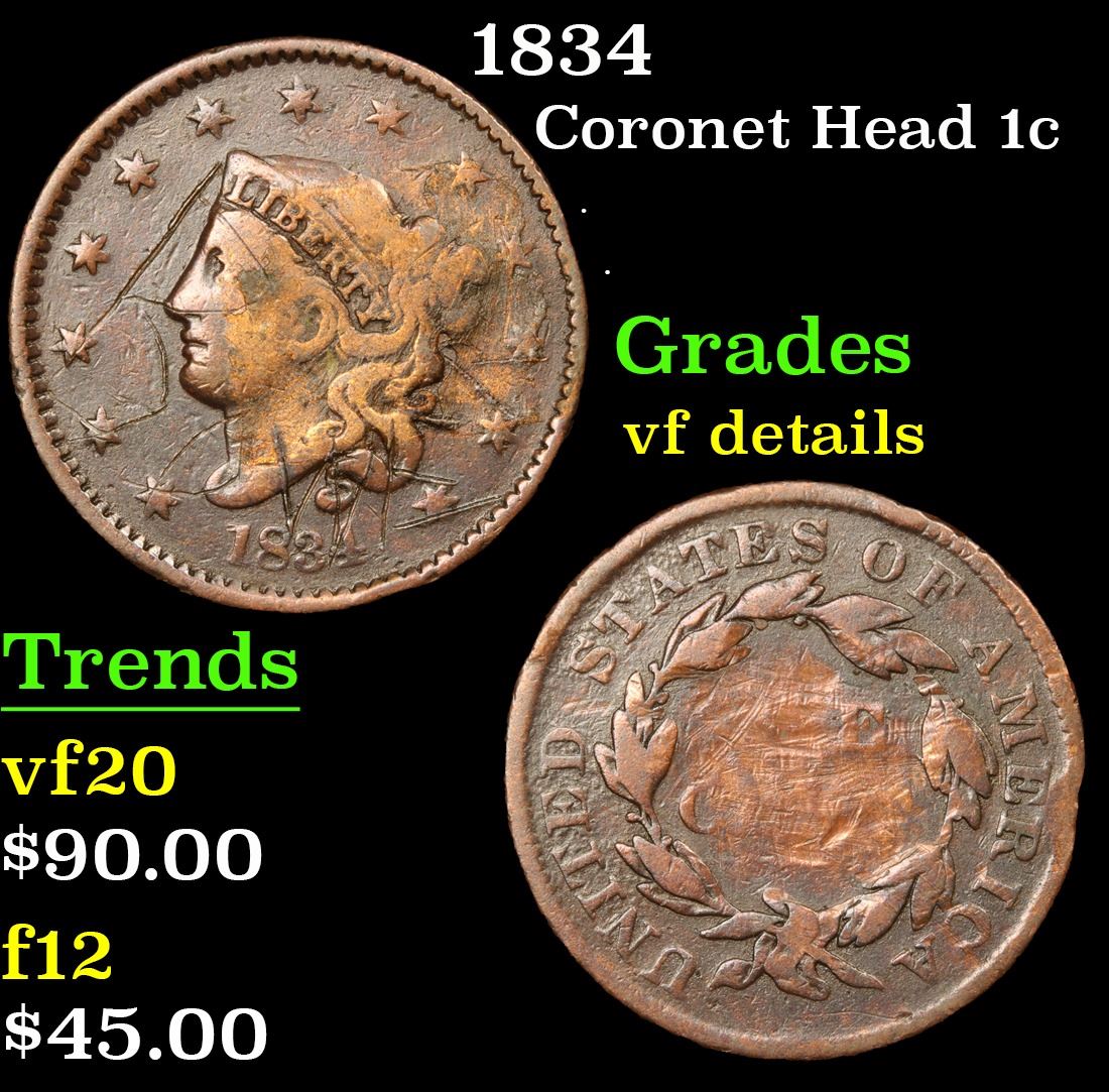 1834 Coronet Head Large Cent 1c Grades vf details.